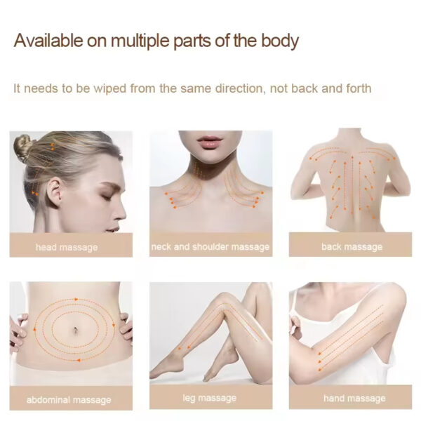 Scrape along the meridians, relieve tight muscles,massage and relax with left oil, it is recommended to exceed 20 minutes. scrape an area for 35 minutes.