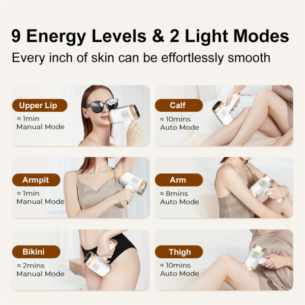 𝐅𝐚𝐬𝐭 𝐑𝐞𝐬𝐮𝐥𝐭𝐬 𝐢𝐧 𝐉𝐮𝐬𝐭 𝟑 𝐖𝐞𝐞𝐤𝐬: Thanks to its powerful energy output (Max. 22J) and 600+nm wavelength, our laser hair remover for women ensures deep penetration into the hair follicle for effective removal. You’ll see visible hair reduction within 3 weeks and full smoothness in 6 weeks. Perfect for any occasion, from everyday life to special events.