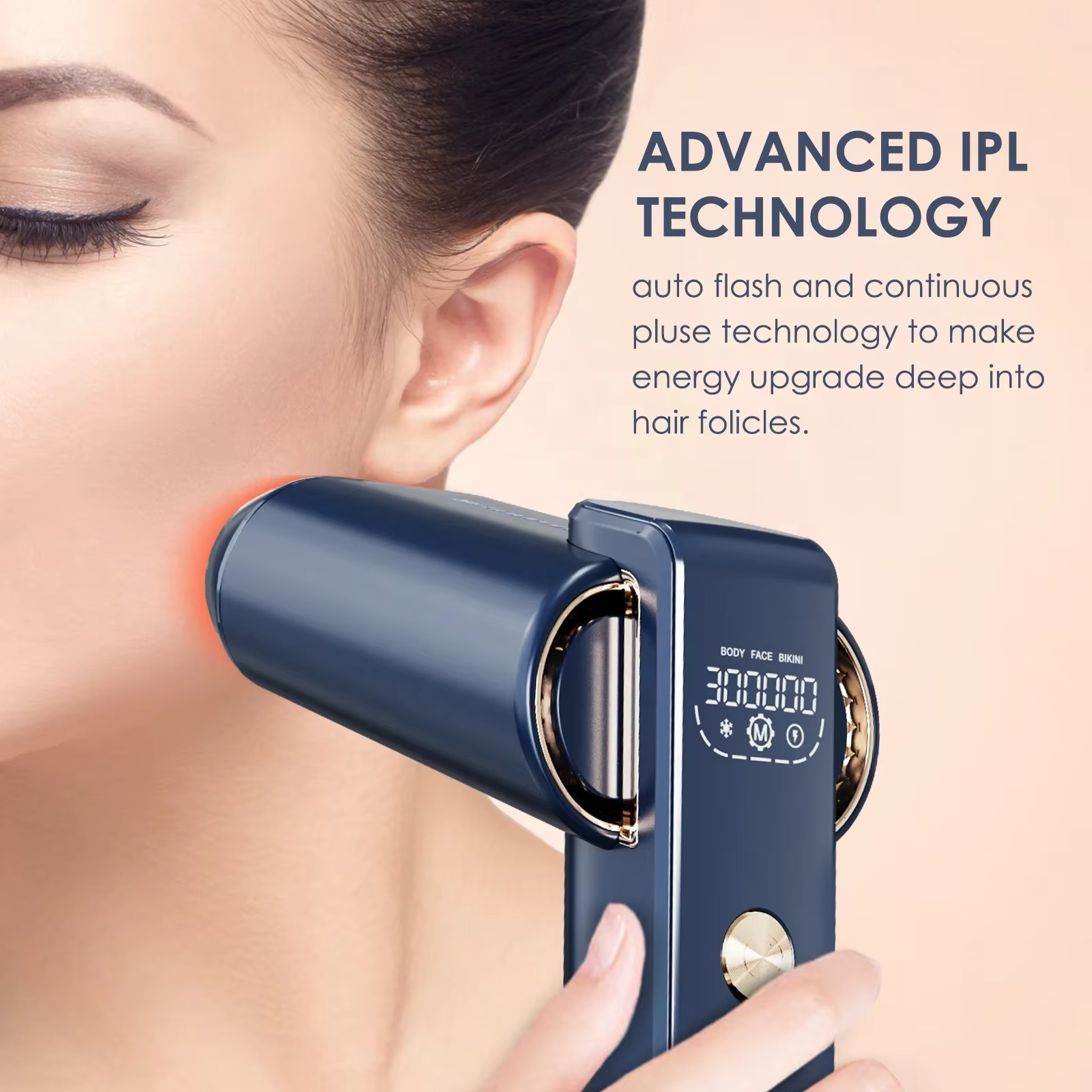 Latest IPL technology: IPL (Intense Pulsed Light) technology clinically proven safe by professional dermatologists and beauty salons. The principle is to emit strong pulsed light, which is absorbed by the hair follicle, thus destroying the hair follicle, to achieve the purpose of inhibiting hair growth and hair removal